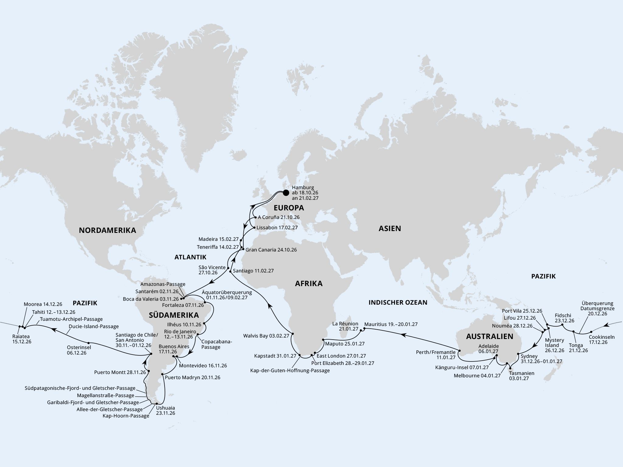 Einmal im Leben auf dem Amazonas durch den Regenwald gleiten, ein Tänzchen am Zuckerhut wagen und die chilenische Gletscherwelt bestaunen. Das neue Jahr in Sydney begrüßen, an den Traumstränden von Mauritius baden und die südafrikanische Wildnis entdecken. Ihr Traum einer Weltreise ist zum Greifen nah! Sehen, fühlen und verlieben Sie sich in die Wunder unserer Erde und starten Sie ein unvergessliches Abenteuer.