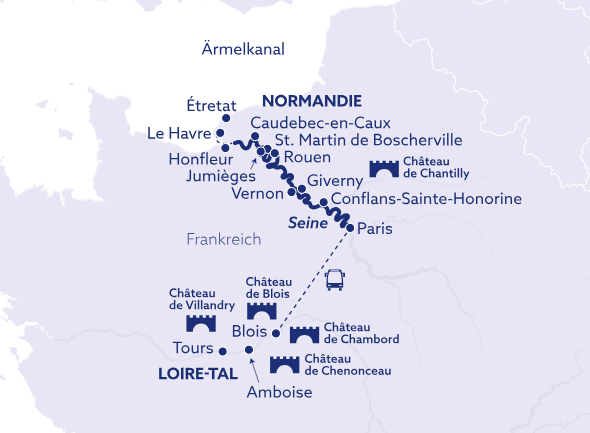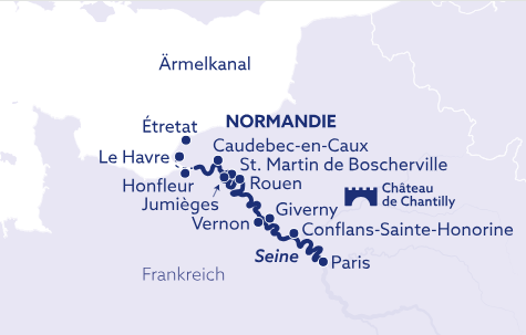 Wenn man die Weltstadt Paris verlassen hat, wird die Landschaft sehr beschaulich. Kleine hübsche Häuser am Flussufer bis hin zu Villen mit gigantischen Gärten ziehen während der Flusskreuzfahrt an einem vorbei. Die Seine ist nicht so stark befahren wie manch andere Flüsse, es ist sehr ruhig und idyllisch. Von Deck aus kann man zahlreiche Vogelarten, viele Kormorane und eine herrlich grüne Landschaft sowie Kalkfelswände beobachten.