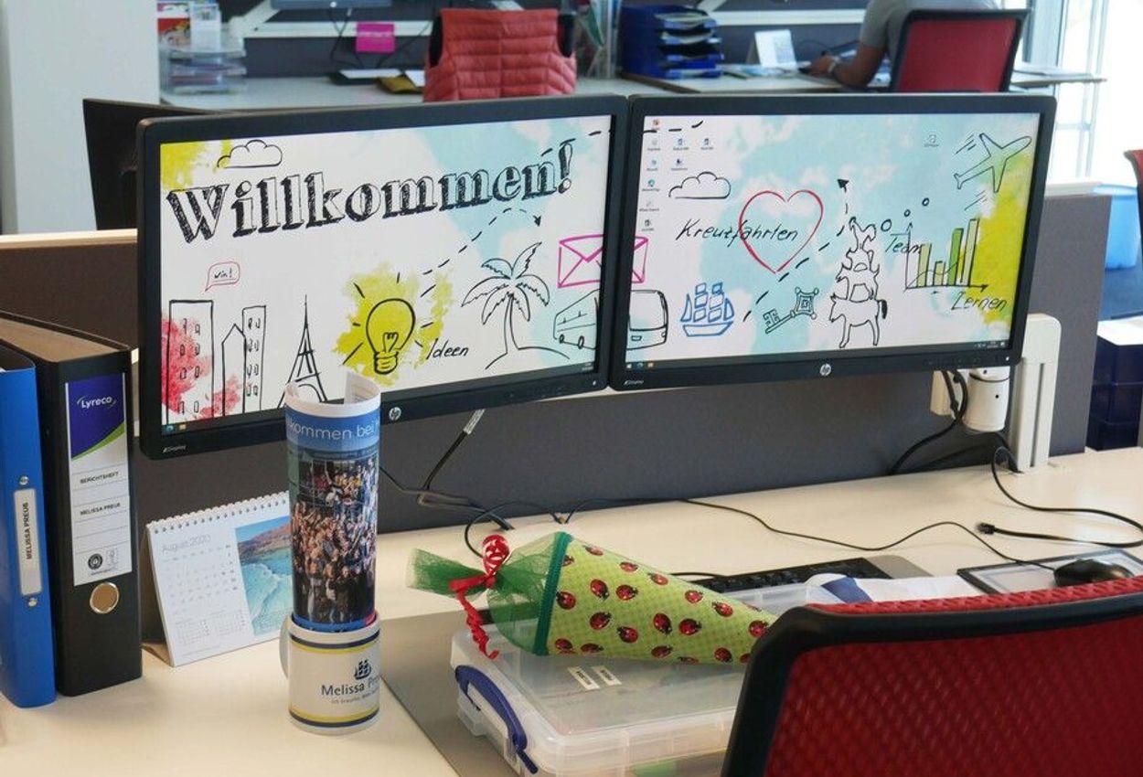 Nachdem wir zusammen Mittag gegessen haben, starteten wir einen Rundgang. Melissa wurde unseren Kolleginnen und Kollegen vorgestellt und ihr wurde gezeigt, welche Abteilung welche Aufgaben verantwortet. An ihrem gedeckten Tisch – ganz nach dem Motto „Einschulung“ – angekommen, haben wir mit ihr zusammen den Computer eingerichtet und ihr die ersten Schritte gezeigt. Anschließend hat ihr Team sie herzlichst empfangen. Hier wurde Melissa dann der Aufbau einer Reise von A bis Z erklärt.