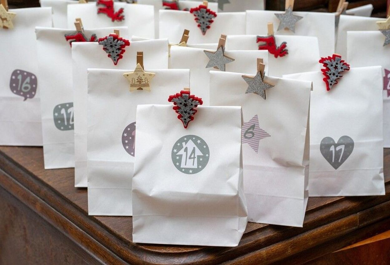 Für unseren Beispiel-Kalender eignen sich sehr gut kleine Tütchen, die man mit Wäscheklammern verschließen kann. Butterbrots- oder Kraftpapier-Tüten sind dafür optimal. Diese finden Sie in vielen Supermärken und Drogeriemärkten ab 1,35 €.