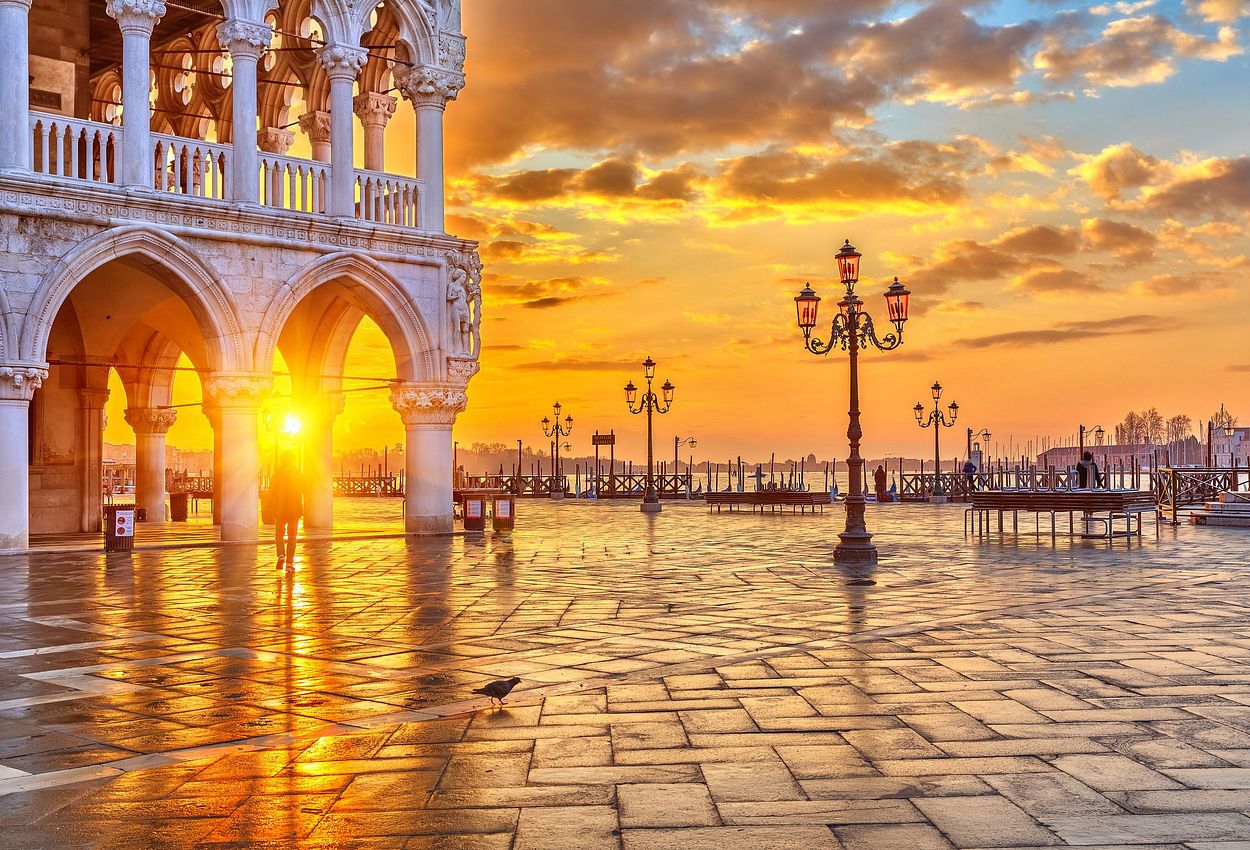 Satt Sonnenuntergang sollten Sie hier einmal den Sonnenaufgang auf dem Markusplatz bestaunen. So früh am Morgen sind noch nicht viele Menschen auf den Beinen, die Stadt wirkt noch etwas verschlafen und Sie können eine einzigartige Stimmung erleben. Doch auch in der Nacht oder aber, wenn der Markusplatz unter Wasser steht, hat dieser Platz seine eigen Magie und es gibt immer eine tolle Geschichte, die man später zu Hause berichten kann.