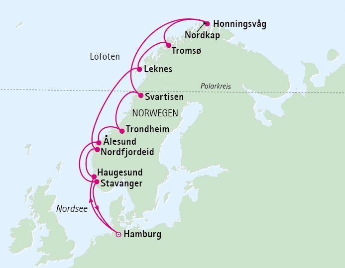 Fahren Sie ab Hamburg in Richtung Norwegen und genießen Sie die spektakulären Landschaften rund um Geiranger, Nordkap und malerische Fjorde. Auch Spitzbergen darf bei so einer Nordland Kreuzfahrt natürlich nicht fehlen.