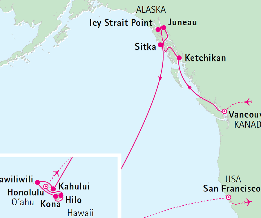 Diese Reise verbindet zwei großartige Erlebnisse miteinander: Eine Busrundreise durch die Nationalparks in Westkanada und eine Kreuzfahrt zu den Naturschauspielen Alaskas