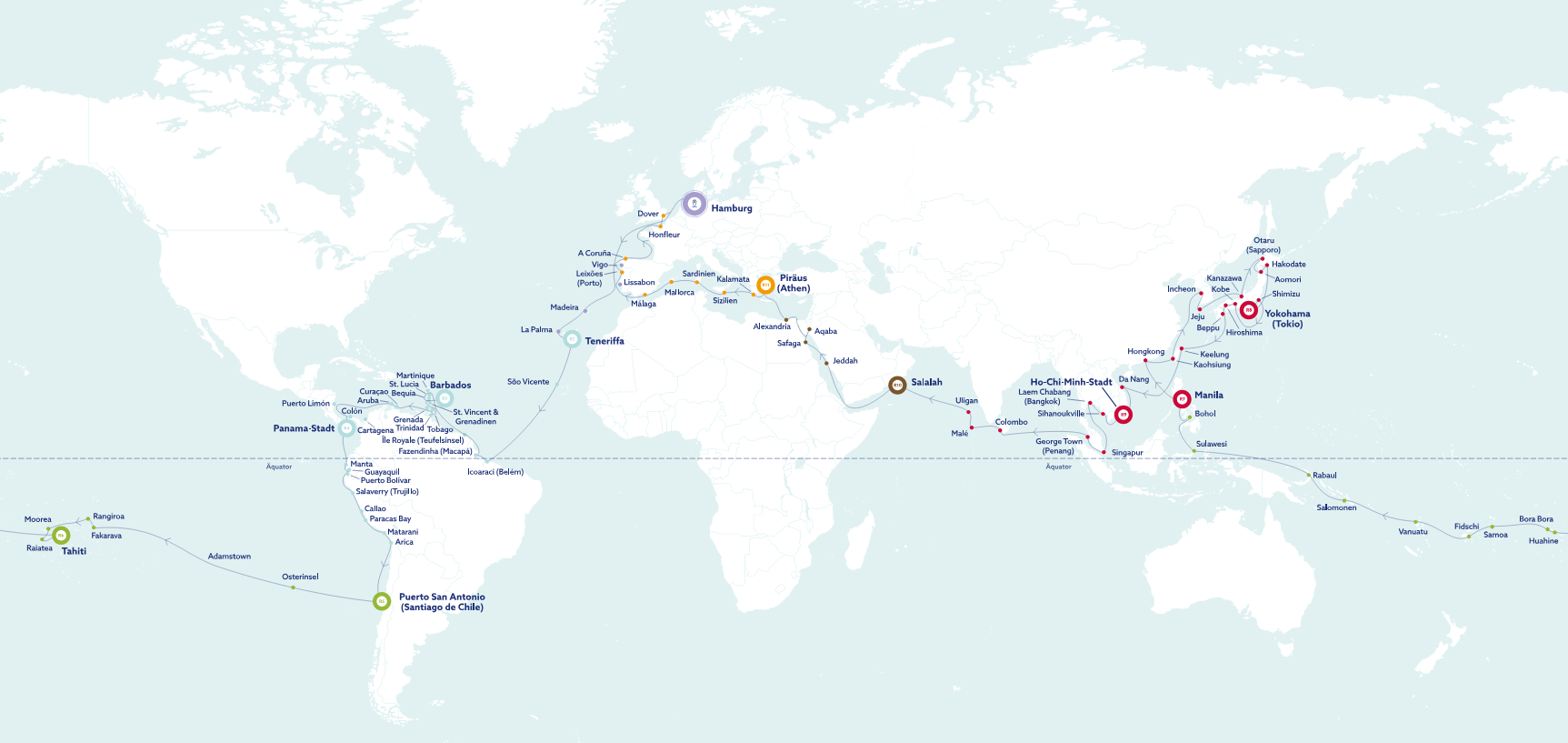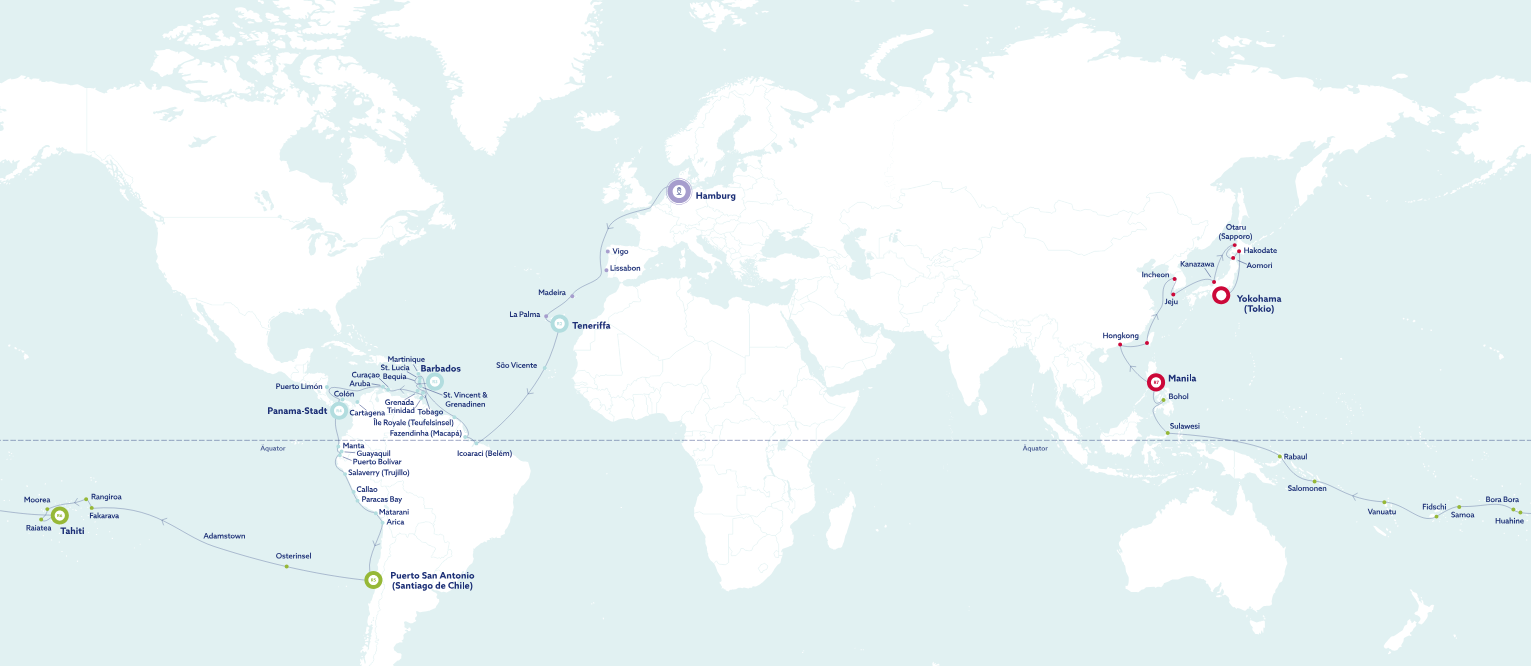 Die Vasco Da Gama fährt eine Vielzahl von ZIelen an. Auf dem Plan stehen die norwegischen Fjorde, die britischen Inseln, die Kanaren, das Mittelmeer, aber auch Fernziele wie die Karibik, Asien und die Südsee. Wussten Sie schon? Sie können auch ganze Weltreisen mit der Vasco Da Gama unternehmen!