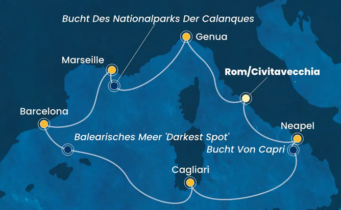 | Bordsprache italienisch und englisch, Bordansagen werden i.d.R. auch auf Deutsch gemacht | Besonderheiten Trinkgelder im Reisepreis enthalten; ausgewählte Getränke im Buffet-Restaurant inkludiert, Kabinenservice verfügbar |