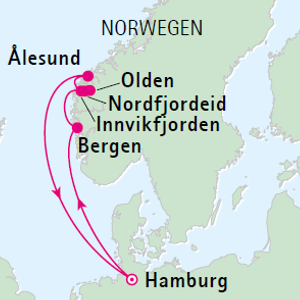 Stolz und erhaben präsentiert sich auf dieser Reise nicht nur Ihre „Königin“, die QUEEN MARY 2, sondern auch die märchenhafte Natur Norwegens. Ab und bis Hamburg führt Sie die Kreuzfahrt durch norwegische Fjorde und hübsche Orte. Freuen Sie sich z.B. auf Bergen, wo der zum UNESCO-Welterbe gehörende Bryggen-Kai mit seinen farbenfrohen Häusern begeistert. Olden ist ein Ort, an dem gewundene Täler und Gipfel mit Wasserfällen und Gletscherwasser harmonieren. Es folgen zwei absolute Routenhighlights: Die Fahrten durch den Innvikfjorden mit dem inoffiziellen Titel „Wunderland von Mutter Natur“ und durch den Nordfjord mit Europas größtem Festlandgletscher sowie dem tiefsten See des Kontinents. Halten Sie unbedingt die Augen offen und Ihr Fernglas griffbereit, während sich Ihr Schiff langsam durch diese norwegischen Juwele schlängelt. Unvergessliche Kulissen sind garantiert!