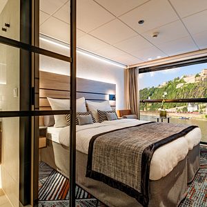 Es stehen 8 Kabinenkategorien zur Auswahl. Helle Farben und modernes Design mit optimaler Raumnutzung: in die Ausstattung der ca. 14 m² großen Außenkabinen wurde besonders viel Herzblut investiert. Das Ergebnis steht einem First-Class-Hotelzimmer nichts nach. Die Doppelbetten können auf Wunsch getrennt gestellt werden. Auf Mittel- und Oberdeck sorgen die absenkbaren Panoramafronten für beste Aussichten. Auf dem Hauptdeck gibt es nicht zu öffnende Fenster. Im Badezimmer finden Sie bequeme Ablageflächen, für Ihre Garderobe ist im Kleiderschrank natürlich ausreichend Platz.