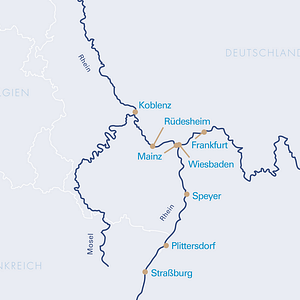 Erleben Sie den Rhein in all seiner Pracht auf einer Reise voller kultureller Schätze, historischer Städte und atemberaubender Landschaften. Startpunkt ist das lebendige Frankfurt am Main, wo moderne Skyline und traditionelle Altstadt ein faszinierendes Zusammenspiel bieten. Von hier aus folgt die Route dem mächtigen Rhein flussabwärts – eine Reise durch die Zeit und durch das Herz Europas.