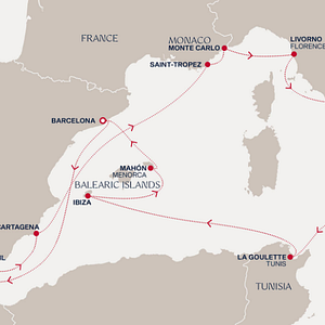 Reisen Sie vom kreativen Barcelona zum Flamenco-Rhythmus von Cádiz und weiter zur faszinierenden Mischung der Kulturen in Tanger. Genießen Sie die Wärme von Motril, entdecken Sie die vielschichtige Vergangenheit von Cartagena und tauchen Sie in den Glamour von Saint-Tropez und Monte Carlo ein. Entdecken Sie die kulturellen Schätze von Florenz und die antiken Wunder Roms. Lassen Sie sich in Sorrent vom Ausblick auf die magische Amalfiküste verzaubern und bestaunen Sie Palermos Architektur sowie das Erbe von Tunis. Auf Ibiza und in Mahón erwartet Sie Inselcharme, bevor wir in das lebhafte Barcelona zurückkehren.