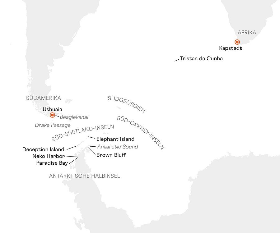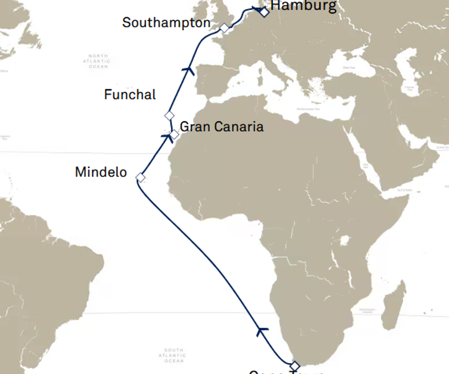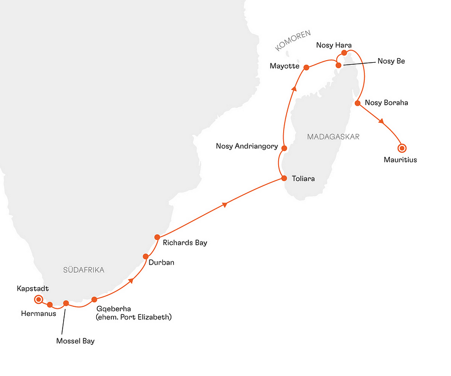 So könnte Ihre Kreuzfahrt-Route aussehen: Vom Einschiffungshafen Durban geht es weiter über Kapstadt bis nach Walvis Bay und Lüderitz und zuletzt nach Jamestown auf St. Helena, dem Verbannungsort Napoleons im Südatlantik. Die britische Kolonie ist ein maritimes Kronjuwel vor der Küste des südlichen Afrika und ein weiterer Geheimtipp für echte Kreuzfahrer. Für all jene also, die auf der südlichen Halbkugel, zwischen Südatlantik, Südafrika und dem Indischen Ozean, dem Winter in Europa entfliehen wollen.