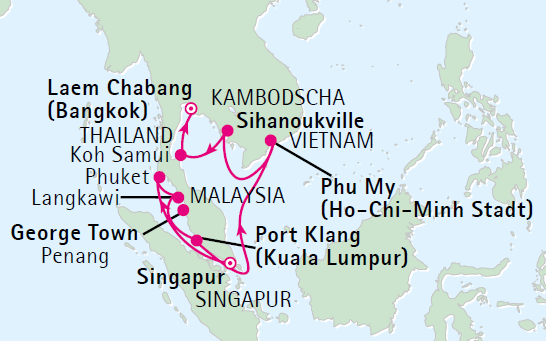 | Einreise | Deutsche Staatsbürger benötigen einen Reisepass, der bei Einreise mindestens noch 90 Tage gültig ist. Für einige Länder ist ein Visum erforderlich wie zum Beispiel für Vietnam oder Kambodscha. Alle Angaben ohne Gewähr. Informieren Sie sich vor Ihrer Reise beim Auswärtigen Amt. |