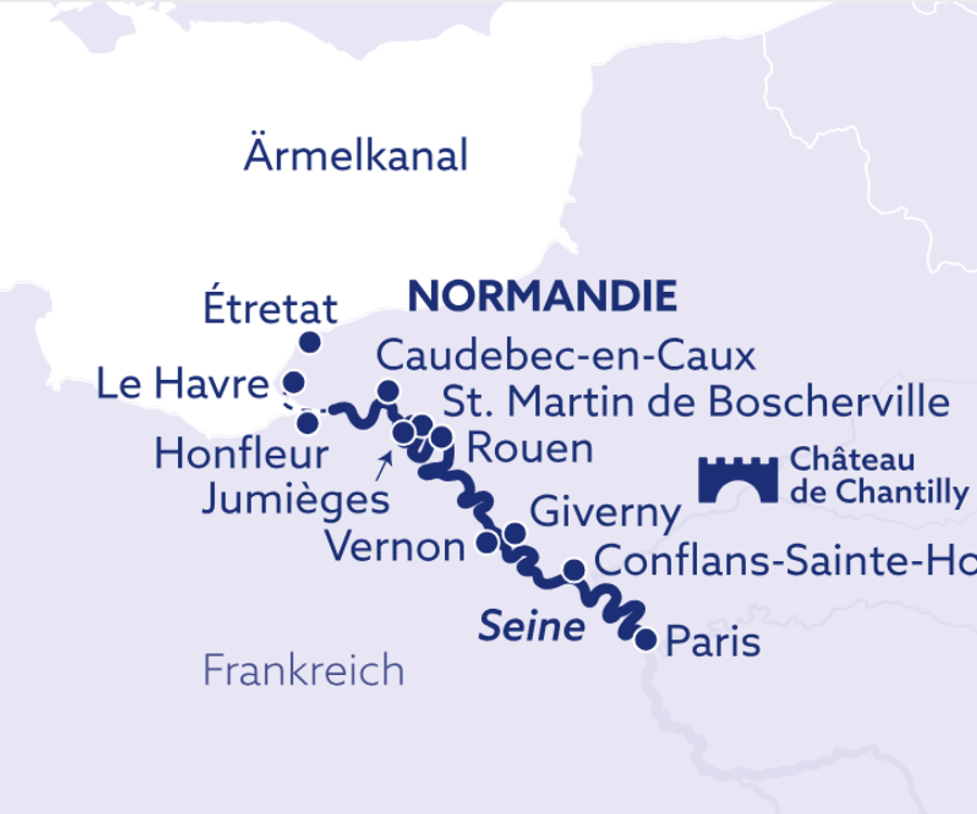 Die Seine fließt quer durch Nordfrankreich und mündet bei Le Havre in den Ärmelkanal. Ausgangspunkt einer Seine Flusskreuzfahrt ist oftmals Paris, die Stadt der Liebe und das Herz von Frankreich. Die französische Hauptstadt bietet unzählige Sehenswürdigkeiten, wie den Eiffelturm, Louvre. Notre-Dame oder Champs-Élysées. Die Uferpromenade der Seine wurde übrigens 1991 in die Liste des Weltkulturerbes aufgenommen.
