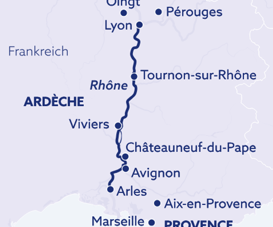 Nach Lyon fließt die Rhône weiter über Vienne und Tournon nach Viviers. Die Altstadt von Viviers ist ein malerisches Viertel mit engen Gassen. Schlendern Sie durch die gepflasterten Straßen und bewundern Sie die historischen Gebäude. Ein weiteres Highlight: Das Château de Grignan, welches sich eine Stunde von Viviers entfernt befindet. Erkunden Sie das Schloss, die Gärten und genießen Sie die herrliche Aussicht auf umliegende Landschaften.