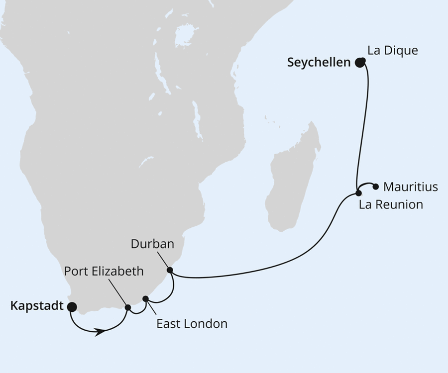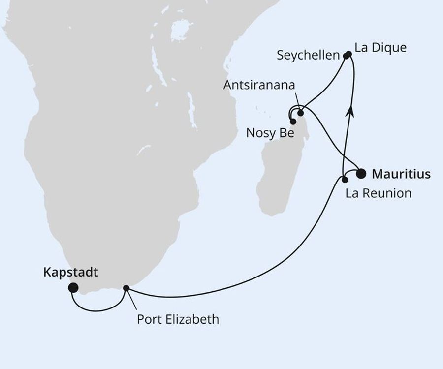 Wie wäre es zum Beispiel mit AIDAstella-Reise über die Seychellen, Mauritius und Südafrika? Diese Schiffsreise führt von Kapstadt über Mosambik zu den Maskarenen und Seychellen. Eine traumhafte Reise zu Traumdestinationen. Übrigens: Von Kapstadt aus starten übrigens auch andere Reisen mit der AIDAstella wie zum Beispiel die Schiffsreise über Südafrika und Namibia.