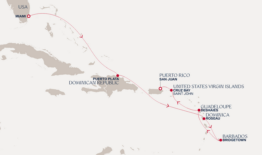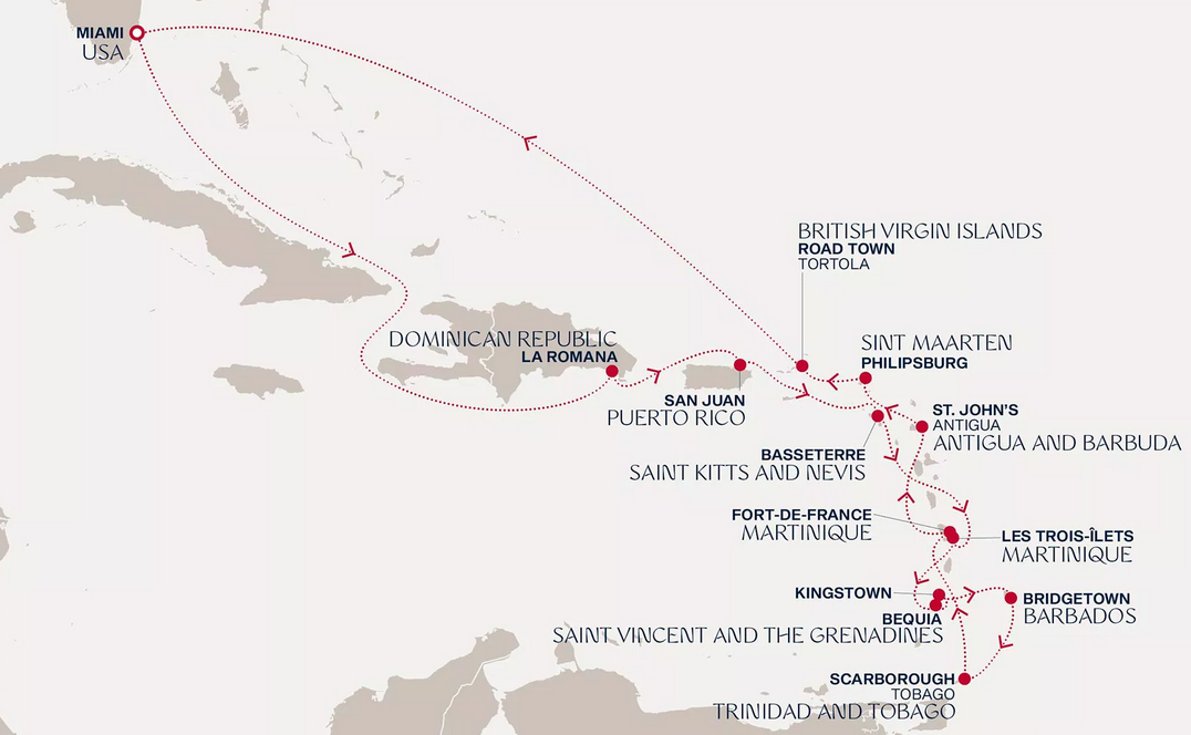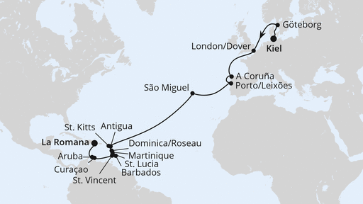 In der Karibik gibt es viele Häfen, die angesteuert werden. Start- und Endhafen sind oft zum Beispiel La Romana in der Dominikanischen Republik, Fort-De-France auf Martinique, Willemstad auf Curacao oder Port Canaveral in Miami.