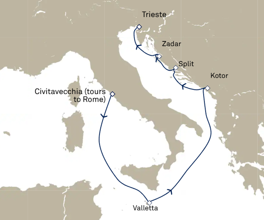 Besuchen Sie neben Venedig unbedingt auch Rom – die Hauptstadt Italiens – auf Ihrer Reise und lassen Sie sich von jahrhundertealter Architektur beeindrucken. Rom ist eine Stadt voller Meisterwerke und Mysterien. Kennzeichnend für die ewige Stadt sind ihre unschätzbaren künstlerischen Reichtümer, sowie der Vatikan. Viele Kreuzfahrten beginnen in Rom bzw. in Civitavecchia. Auch Triest im Nordosten ist mit dem Piazza dell’Unita d’Italia sehenswert, genauso wie die die Insel Sardinien mit langen Küsten, Sandstränden und einem bergigen Wanderwegen.
