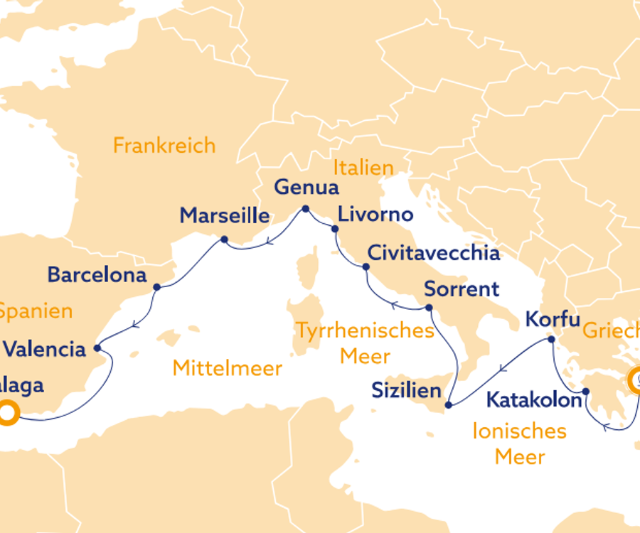 Das Mittelmeer umfasst ca. 2,5 Millionen km² und gehört damit eher zu den kleineren Meeren der Erde. Als Nebenmeer des Atlantischen Ozeans wird es begrenzt von drei Kontinenten und zwanzig verschiedenen Staaten. Überwiegend trockenen Sommertage und milde Winter ermöglichen aufregende Mittelmeer-Kreuzfahrten das ganze Jahr über und bieten auch Pauschalurlaubern sonnenverwöhnte Urlaubsziele. Ob kulinarisch, landschaftlich oder kulturell, das Mittelmeer bietet Ihnen alle Highlights!