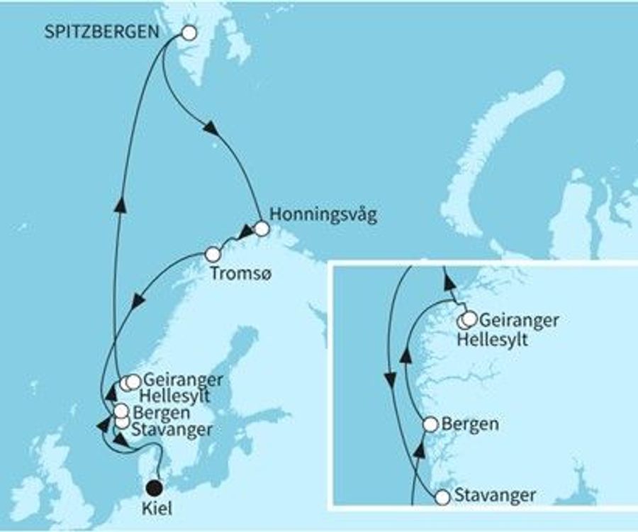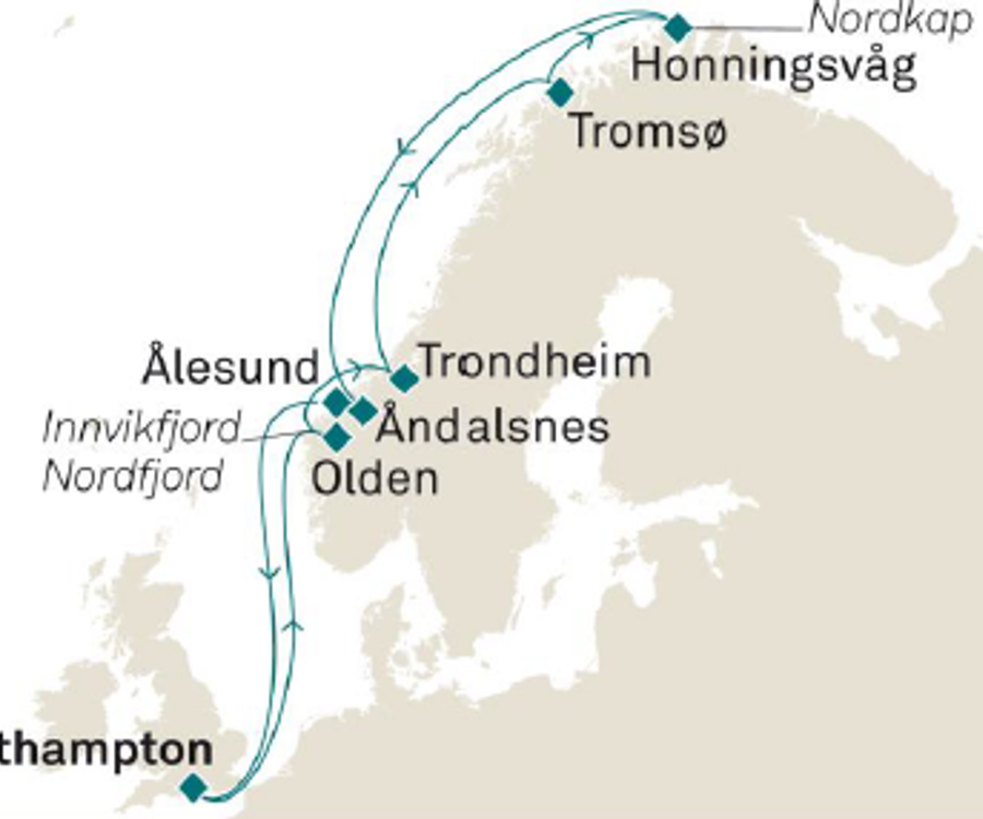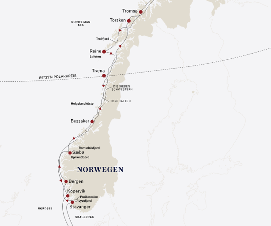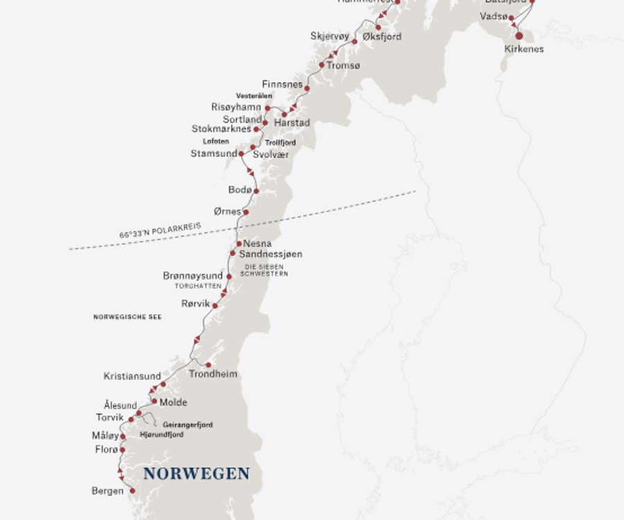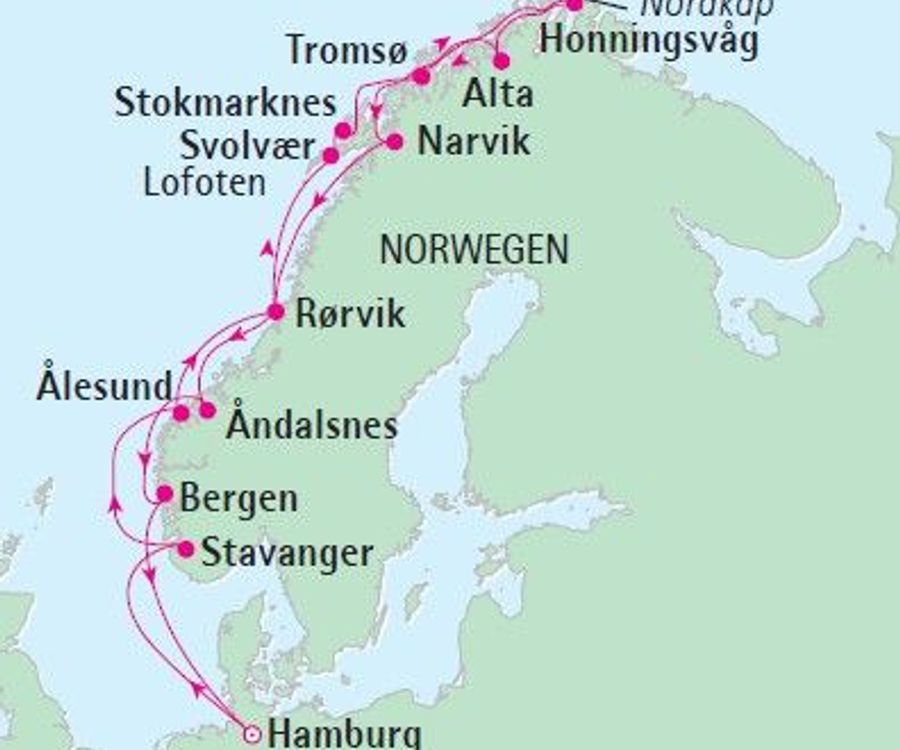 Viele Schiffsreisen Richtung Nordkap beginnen in Bremerhaven. Die meisten Kreuzfahrten zum Nordkap führen dann über die Häfen von Alesund, Bergen und Tromso. So haben Sie die Möglichkeit, die Westküste Norwegens zu erkunden. Vielleicht haben Sie auch das Glück, Nordlichter am nächtlichen Himmel zu beobachten. An der Küste erwarten Sie malerische Landschaften und einzigartige Fjorde.