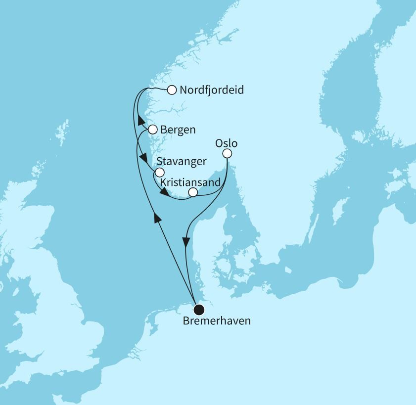 Entdecken Sie die vielfältigen Reiseziele in Norwegen per Schiff. Meist beginnen Norwegen Kreuzfahrten in Kiel, Hamburg oder Bremerhaven - sehr praktisch: für Ihre Kreuzfahrt nach Norwegen brauchen Sie keinen Flug. Nach einem Seetag auf Ihrer Reise ist Norwegen erreicht. Auf einer Kreuzfahrt Fjorde satt erleben - Das ist das Ziel einer Norwegen Seereise. Das Spektakel aus einzigartigen Naturschönheiten, imposanten Tälern, tosenden Wasserfällen und blühenden Wiesen kann beginnen. Die Aussichten sind atemberaubend, denn die Küste des Königreichs ist die längste und stark zerklüftetste der Welt. Anteil daran haben die Fjorde: Meeresarme, die weit ins Festland hineinreichen. Die Ufer sind schwer zu besiedeln, da die Hänge oft sehr steil sind. Der wohl bekannteste Fjord ist der Geirangerfjord. Doch nicht nur atemberaubende Natur können Sie während Ihrer Norwegenreise entdecken. Und wenn Sie schonmal da sind, bieten sich noch weitere tolle Ziele im Anschluss an Ihre Norwegen-Kreuzfahrt an. Wie wäre es z.B. mit dem nahegelegenen Dänemark? Auch eine Ostsee-Kreuzfahrt oder eine Kreuzfahrt nach Island lässt sich wunderbar an Ihre Schiffsreise anschließen.