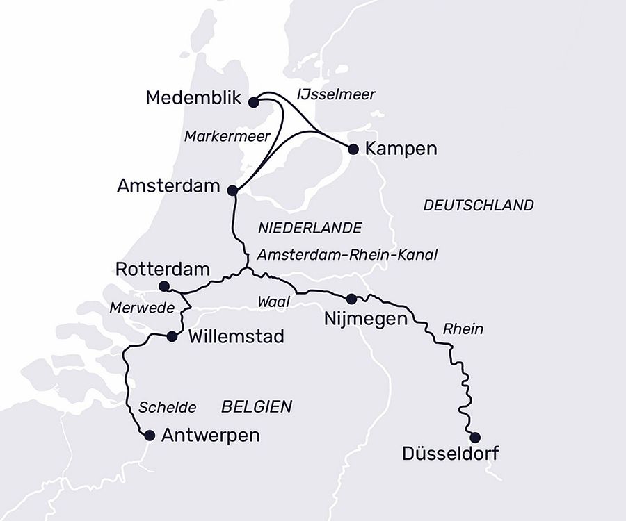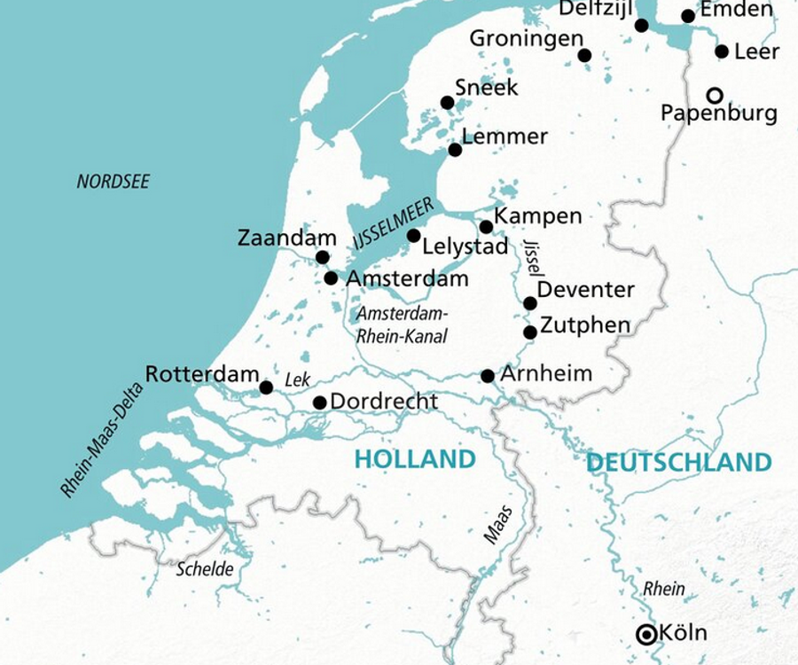 Flussabwärts kann die Rhein Kreuzfahrt ab Köln durch die Landschaften am Niederrhein Richtung Holland führen. Fahren Sie auf dem Rhein beispielsweise nach Amsterdam, Rotterdam oder sogar bis ins Ijsselmeer. Entdecken Sie auf einer Fahrt auf dem Rhein bis in die Niederlande beschauliche Städte und große Metropolen, beispielsweise Antwerpen, die Diamant-Stadt, das kleine Gent mit historischen Häusern und Straßencafés oder die große turbulente Metropole Amsterdam.