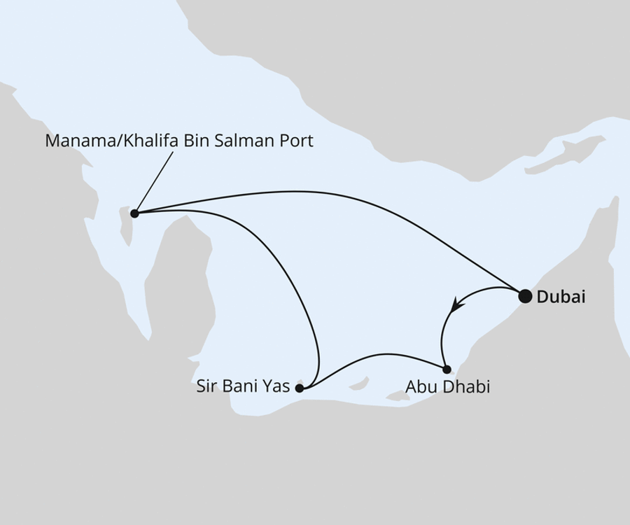 Oft werden Schiffsreisen nach Abu Dhabi mit anderen Zielen verknüpft wie zum Beispiel Manama in Bahrain, dem Nachbaremirat Dubai oder Saudi-Arabien. Stöbern Sie jetzt in unseren Angeboten!
