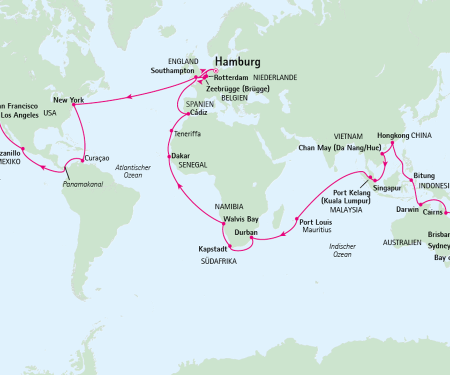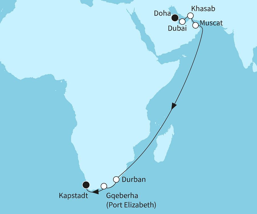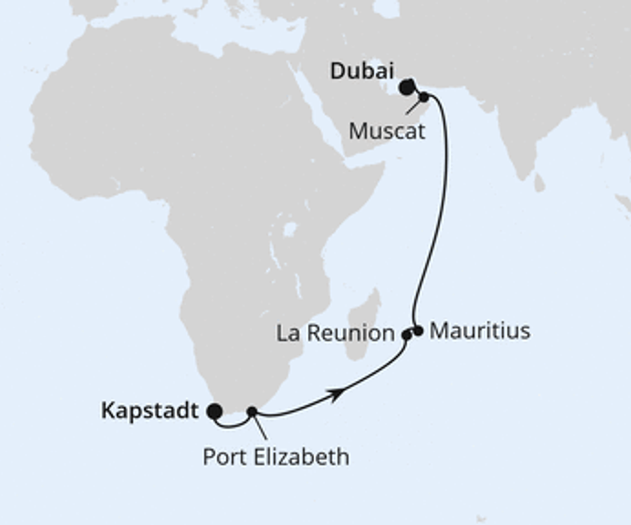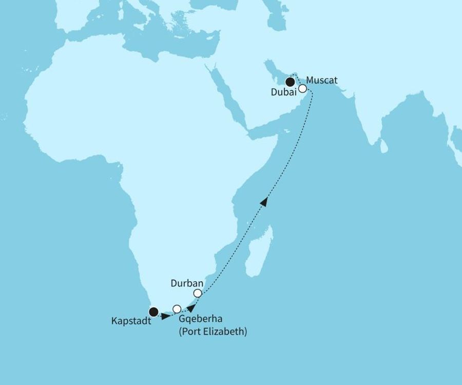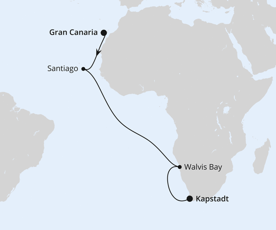 So könnte Ihre Kreuzfahrt-Route aussehen: Vom Einschiffungshafen Durban geht es weiter über Kapstadt bis nach Walvis Bay und Lüderitz und zuletzt nach Jamestown auf St. Helena, dem Verbannungsort Napoleons im Südatlantik. Die britische Kolonie ist ein maritimes Kronjuwel vor der Küste des südlichen Afrika und ein weiterer Geheimtipp für echte Kreuzfahrer. Für all jene also, die auf der südlichen Halbkugel, zwischen Südatlantik, Südafrika und dem Indischen Ozean, dem Winter in Europa entfliehen wollen.