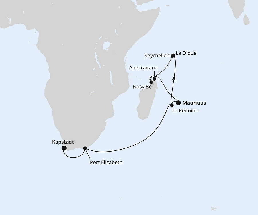 Südafrika-Kreuzfahrten lassen sich beinahe nach Belieben um Routen in den Südatlantik oder den Indischen Ozean erweitern. Vorbei an echten Entdecker-Revieren wie Mosambik, Sansibar oder Madagaskar, lässt sich somit eine Südafrika Kreuzfahrt problemlos mit einer Seereise zu den Trauminseln des Indischen Ozeans, wie den Seychellen, kombinieren. Ob Mauritius, die Seychellen-Insel Mahé, La Réunion oder die „Parfüminsel“ Nosy Bé vor Madagaskar: Diese Traumdestinationen mit ihren Naturparadiesen und ihren endlos weißen Traumstränden sind bereits im Rahmen einer zwei- bis dreiwöchigen Südafrika Schiffsreise bequem erreichbar. In Verbindung mit einem entspannten Bade-Kurzurlaub eignen sich gerade Port Louis und sein internationaler Flughafen als idealer Schlusspunkt für eine solche Kreuzfahrt in den Indischen Ozean. Viele Kreuzfahrtschiffe der verschiedensten Reedereien bringen Sie hin. Oder wie wäre es mit einer Kombination mit den Kanaren wie Teneriffa, Fuerteventura oder Gran Canaria?
